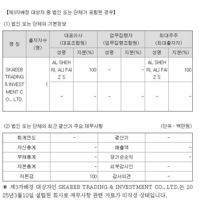 금양 공시자료를 자세히 보면 ‘스카엡T&I’란 사우디 기업의 실체 부터가 의문 투성이다. 공시에는 이 사우디 기업의 대표이사이자 100% 대주주가 ‘AL SHEHRI, ALI FAIZ S.’란 인물이고, 이 회사는 지난 3월19일 자본금 1억원으로 신설된 법인이란 사실 외에 다른 재무관련 자료 공시가 일체 없다. 7개월 전 설립된 신설 법인이이서 재무자료가 없을 수 밖에 없다는 설명만 붙여놓고 있다.