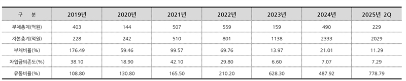 주요 재무지표 추이를 살펴보면, 2019년 말 대비 올해 2분기 말 자본총계는 10배 가까이 증가했고, 부채총계는 절반으로 줄며 부채비율은 176.39%에서 11.29%로 165.1%포인트(p) 감소했습니다. 같은 기간 차입금 의존도 역시 38.10%에서 7.29%로 30.81%p 하락했습니다. 2023년 이후부터는 6~7%대를 유지하며 사실상 무차입 경영에 돌입했습니다. 기업의 단기 채무 상환 능력을 측정하는 유동성 지표인 유동비율은 2019년(108.80%) 보다 669.99%p 증가해 올해 2분기 778.79%를 기록했습니다.