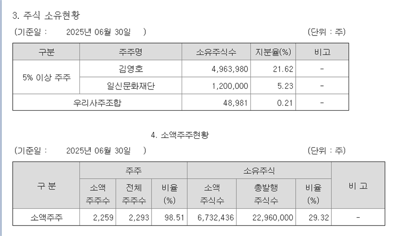 일신방직도 1951년 광주에서 설립된 오랜 역사의 방직기업이다. 최대주주인 김영호 대표이사 회장(21.62%) 등 최대주주 및 특수관계인 지분합계가 52.21%에 이른다. 양 사 모두 현재까지 경영권 분쟁 같은 것이 거의 없었던 안정된 지배구조라고 볼 수 있다.