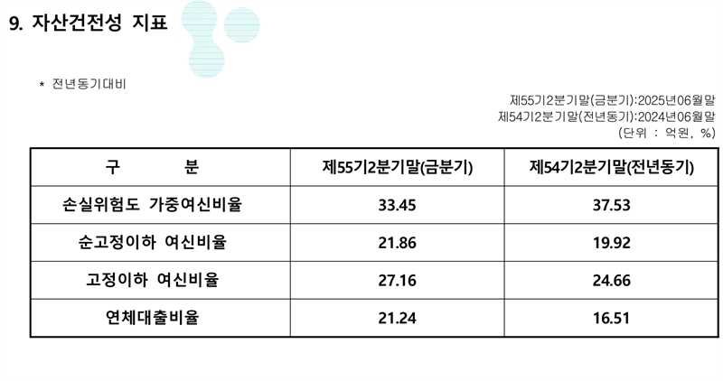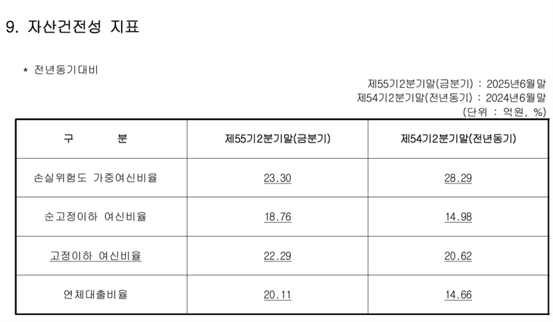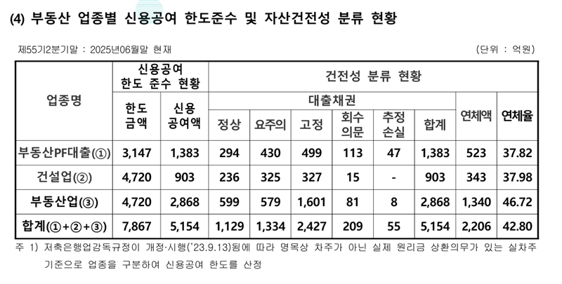 구조조정 일환으로 부실 자산이나 고금리 예금들을 대거 정리하면서 대출-예금-자산 모두 대폭 감소했다. 그런데도 지난 6월 말 연체율은 부동산PF대출이 38%, 건설업이 38%, 부동산업이 47%에 각각 달한다. 아직도 부실을 정리해야할 부동산관련 대출들이 특히 많다.