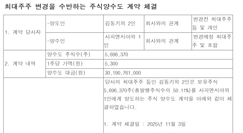 이 지분을 인수하는 새 최대주주는 사피엔시아(399만8257주. 35.17%)와 한국에아이이조합(169만8113주. 15%)이다. 계약금 30억원은 이날 지급되었고, 잔금 272억원은 오는 12월19일 지급예정이라고 밝혔다.