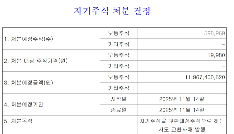교환대상이 될 자사주는 59만8969주(지분율 4.5%)로, 이 회사가 보유한 자사주 전량을 이번에 EB로 처분한다. 교환가격은 주당 19980원으로, 지난 5일 종가보다 15% 할증된 금액이다. 표면이자율이나 만기 금리 모두 0%이며, 만기는 2030년.