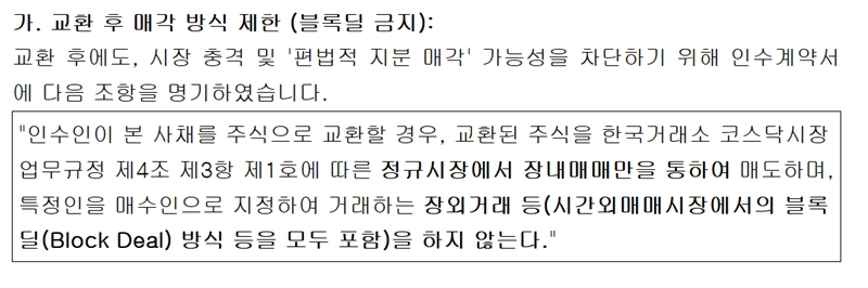 특히 투자자 보호 및 최근 강화된 '자기주식 처분 관련 규제'의 취지(편법적 지분 매각 방지)를 완벽하게 준수하기 위해, 이번 EB의 인수인('티아이피엠디엠제1호사모투자 합자회사')과 '다층적 매각 제한'에 관한 사전 협약을 체결했다고 밝히기도 했다.