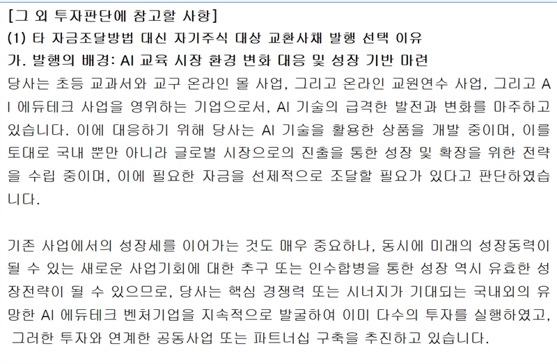 또 이번 EB 발행 목적은 'AI 등 신기술, 교육, 에듀테크 사업 등을 하는 벤처 기업 또는 그러한 산업에 주로 투자하는 전문 펀드에 투자하기 위한 것이라고 설명했다. 무차입경영기조를 유지하고 있어 신규차입은 어렵고, 보유현금(651억원)도 AI디지털 교과서 개발 등에 이미 배정되어 있어 부득이 자사주를 활용한 EB를 발행한다고도 설명했다.