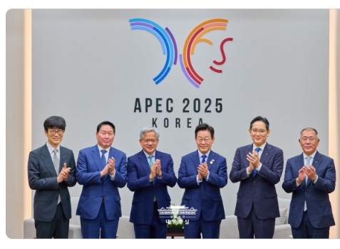 경주 APEC 행사장에서 젠슨 황 등 기업인들과 만난 이재명 대통령(왼쪽서 네번째)