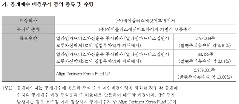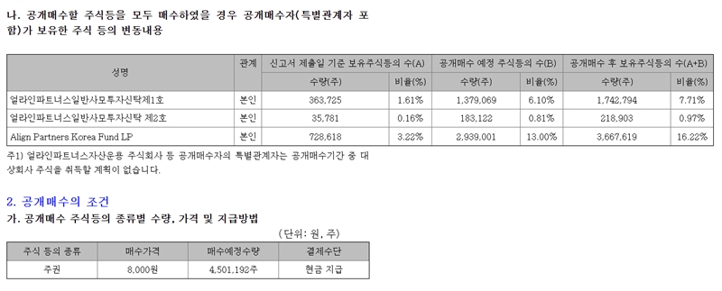 얼라인파트너스는 공개매수 직전까지 얼라인파트너스 지분 4.99%를 보유 중인데, 18일부터의 공개매수를 통해 지분율을 24.9%까지 높인다는 것이다.