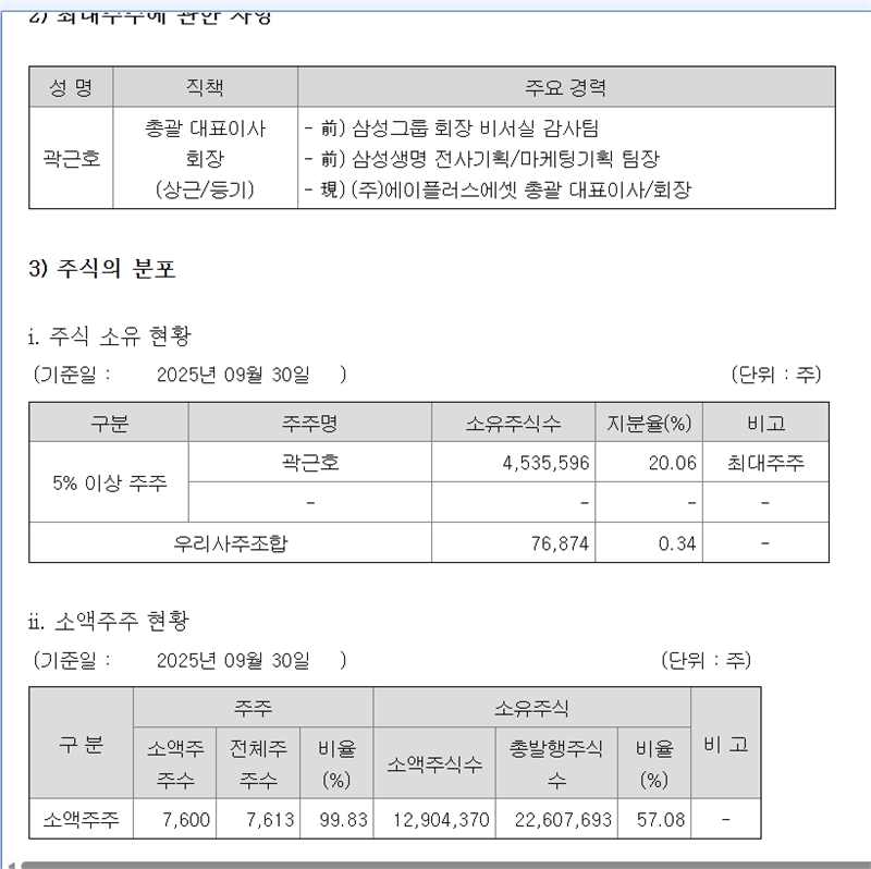 에이플러스에셋어드바이저의 지난 9월 말 기준 최대주주는 곽근호 에이플러스에셋그룹 총괄 대표이사 회장(20.06%)이며, 최대주주 및 특수관계인 지분율합계는 30.19%다. 얼라인파트너스가 공개매수에 성공할 경우 최대주주와의 지분차이는 5.29%포인트 밖에 되지않는다. 9월 말 소액주주 비율은 57.08%다.
