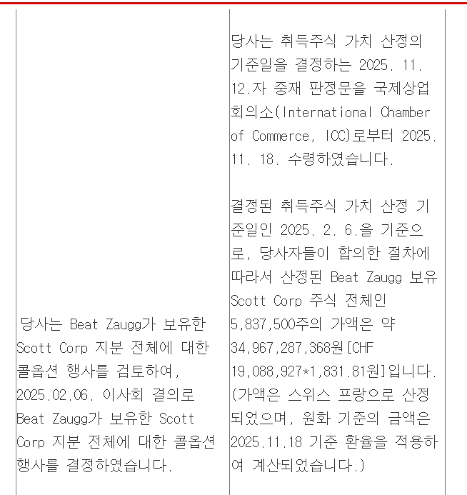 결정된 취득주식 가치 산정 기준일인 지난 2월6일을 기준으로 당사자들이 합의한 절차에 따라 비아트 자우그 보유 스캇 주식 전체인 583만7500주의 가액을 산정해본 결과 약 349억6728만7368원이라고 설명했다. 지난 18일 기준 스위스 프랑 환율을 적용해 계산된 수치다.