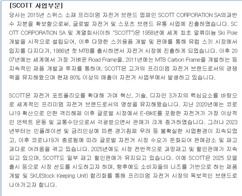 영원무역 분기보고서는 “올해도 시장 전반적으로 과잉재고 및 할인판매가 지속되고 스캇도 일부 재고 할인 판매가 유지되고 있다”면서도 “올해 새 모델 출시 등으로 시장 선도를 시도하고자 하며 향후에도 신제품개발 및 합리화를 통해 프리미엄 자전거 시장에서 독보적 브랜드로 나아갈 것”이라고 밝혔다.