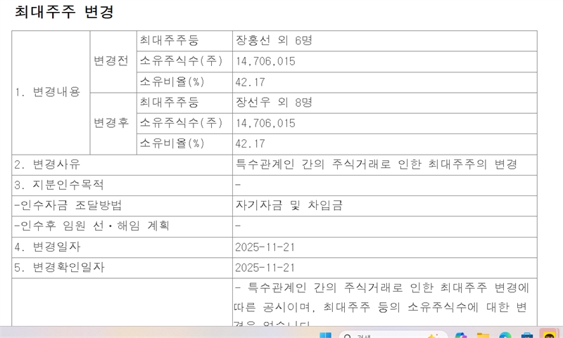 장선우 대표가 지분율 현재 8.92%로, 장 회장 지분전량 처분후 개인대주주들 중에서 지분이 가장 많아 “변경 후 최대주주”라고 했을 수 있지만 아무래도 다른 숨은 지분들을 망라할 경우 실질적 최대주주라서 이런 표현을 했을 가능성이 높기 때문이다.