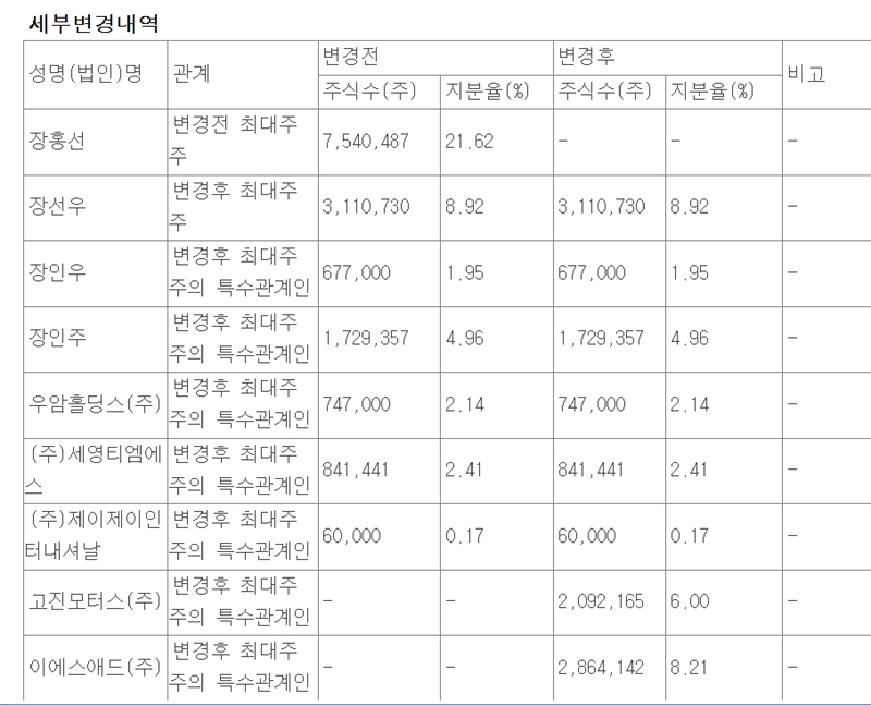 우선 장 회장 지분 6%를 사 간 고진모터스는 앞에서 언급했듯 주주들 지분을 공개하지 않고 있다. 장 회장이 최대주주이고, 장인우 대표는 2대주주 쯤으로 추정되지만 장인우 대표가 최대주주가 아니어서 그가 장악한 개인기업이 아닌것은 확실하다.
