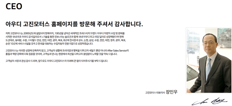 고진모터스 홈페이지의 장인우 대표 인사말과 얼굴사진