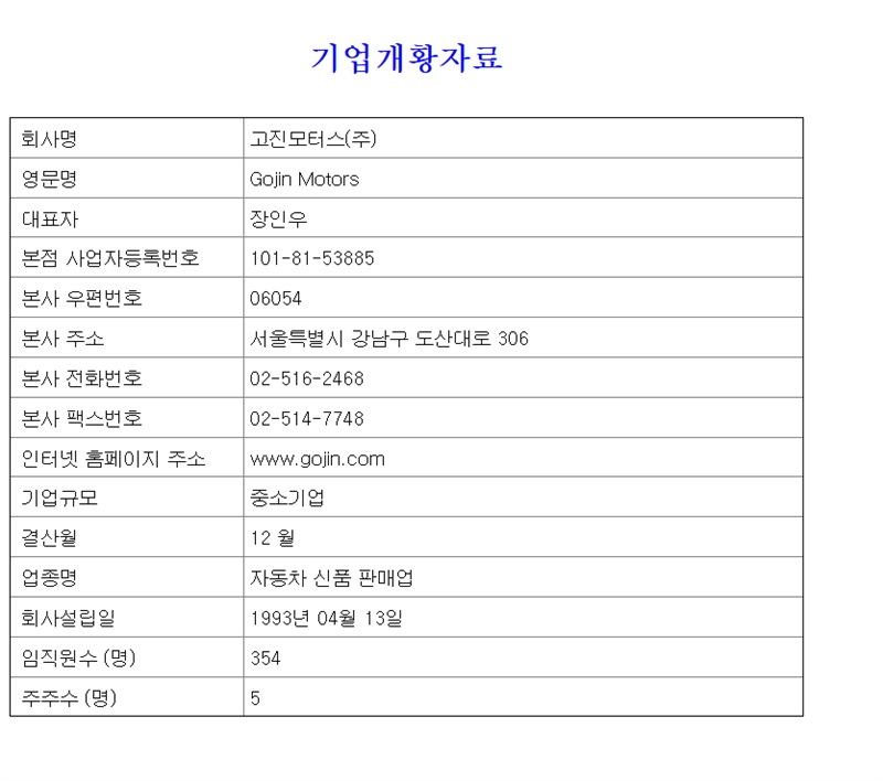 장인우 대표가 단독대표로 나와있는 작년 말 고진모터스 감사보고서 기업개황