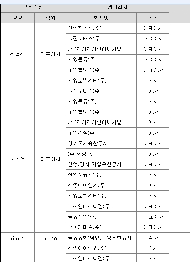 반면 형인 장인우 대표는 작년 말 기준 단독 대표이사를 맡고 있는 곳은 세영모빌리티 뿐이고, 자신이 맡는 것으로 알려진 고진모터스와 선인자동차에선 아버지 장 회장과 공동대표인 것으로 보인다. 세양물류에서도 작년 말 현재 장 회장과 공동대표다.