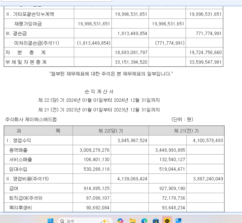 제이에스애드컴(이에스애드)의 결손, 매출(영업수익) 등