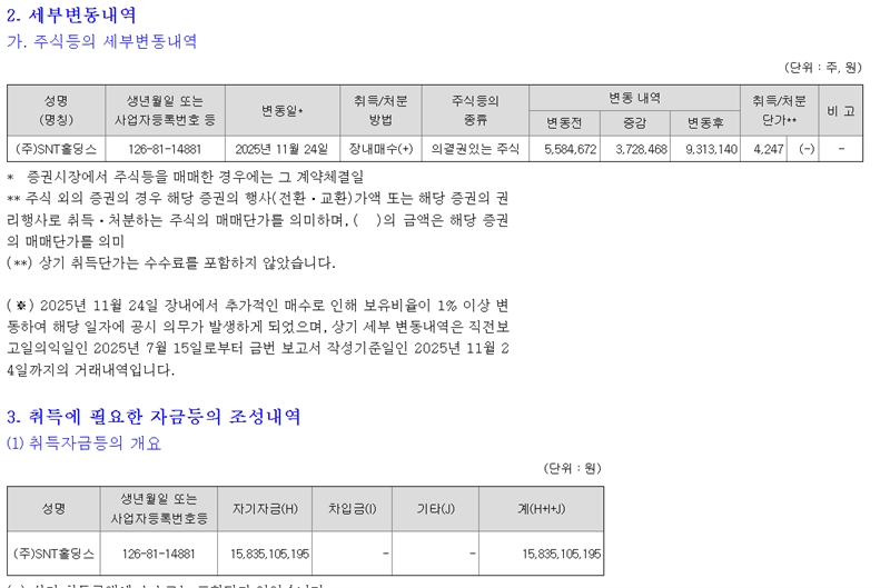 SNT홀딩스의 지난 24일 스맥지분 추가 장내매수 관련 공시