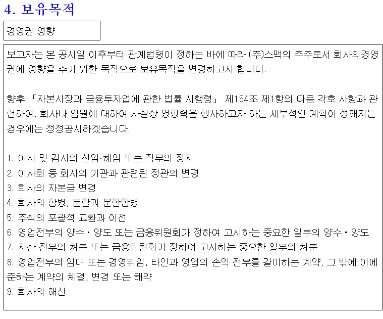 SNT홀딩스의 스맥 지분 보유 목적 변경 공시
