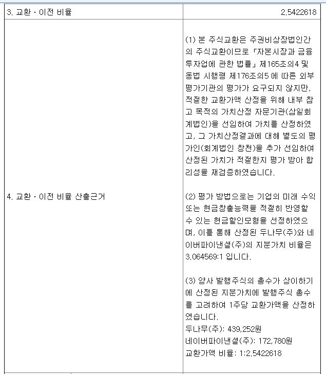 하지만 양사 발행주식의 총수가 다르기 때문에 산정된 지분가치에 발행주식 총수를 고려해 1주당 교환가액을 산정했다며 그 결과 두나무는 43만9252원, 네이버파이낸셜 17만2780원로 나왔다고 설명했다. 그래서 교환가액 비율이 1:2.5422618이 된다는 것이다.