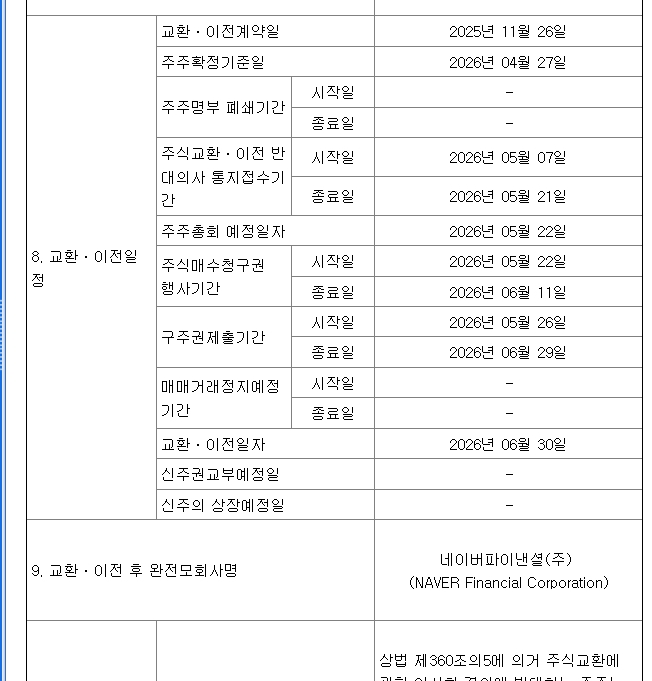 주식매수청구권 행사기간은 내년 5월22일부터 6월11일까지이며, 구주권 제출기간은 내년 5월26일부터 6월29일까지다. 교환ㆍ이전일자는 내년 6월30일.
